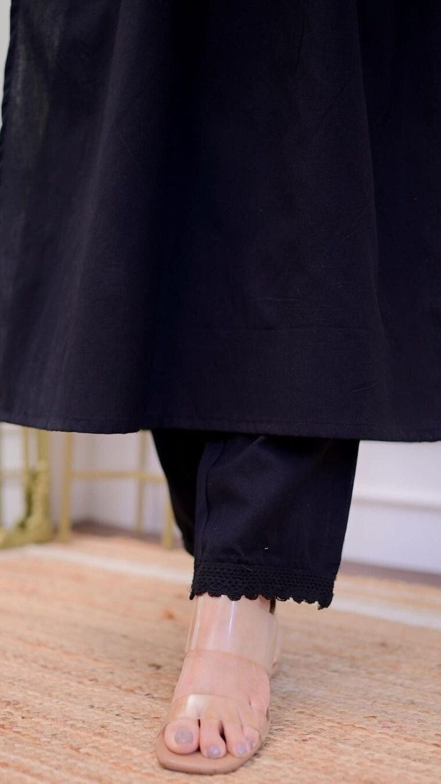 Design Details: Black Cambric long kurta set with round neckline, white pleated and embroidered yoke, and relaxed flared silhouette