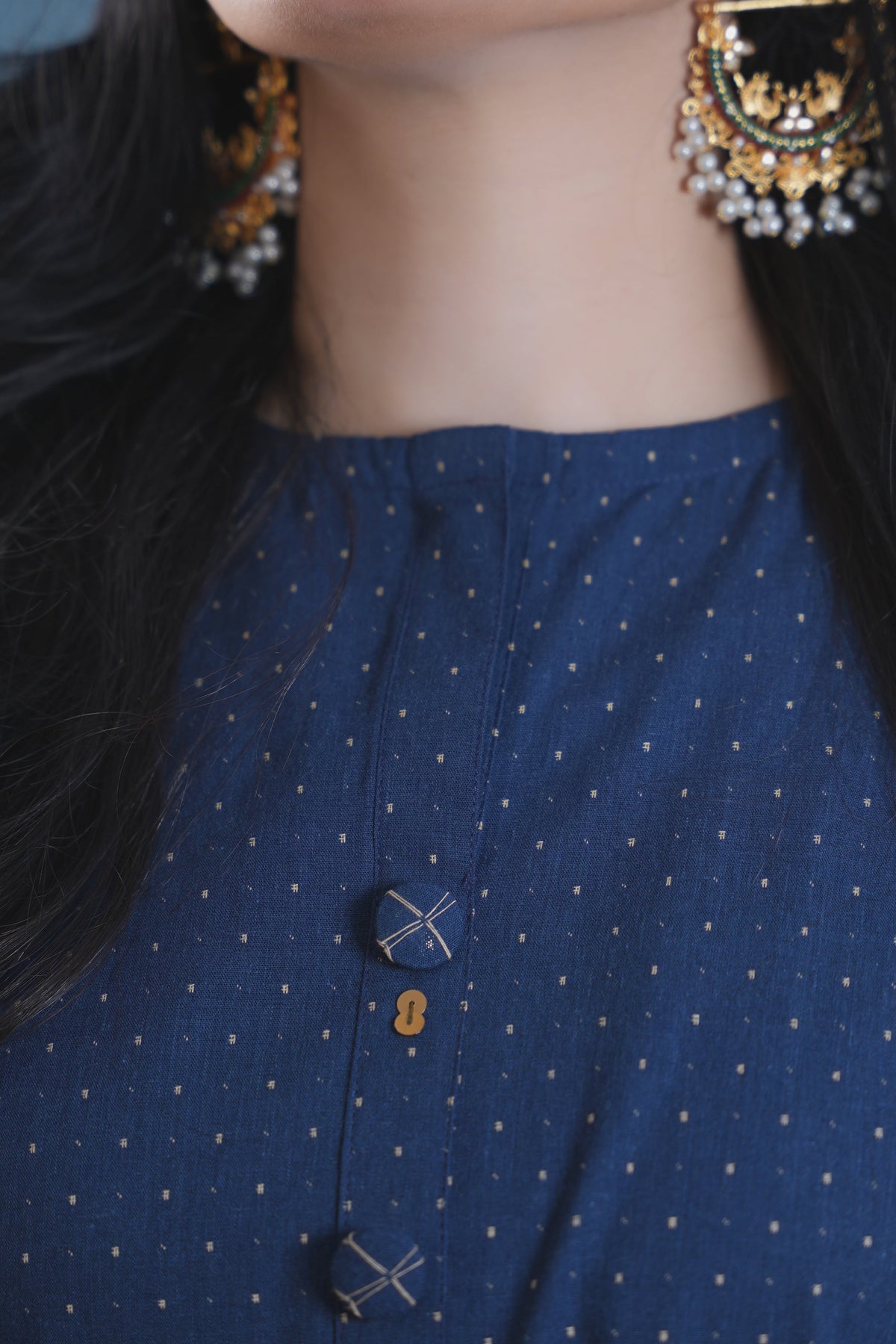 Design Details: Stay cozy this winter in this sophisticated 2-piece Khaddar ensemble. The classic navy shirt with gold foil print is perfectly paired with matching plain trousers.