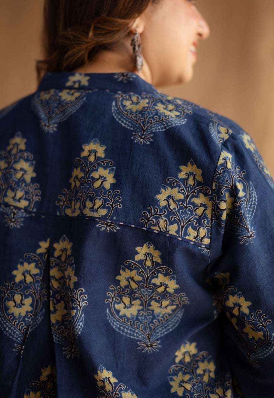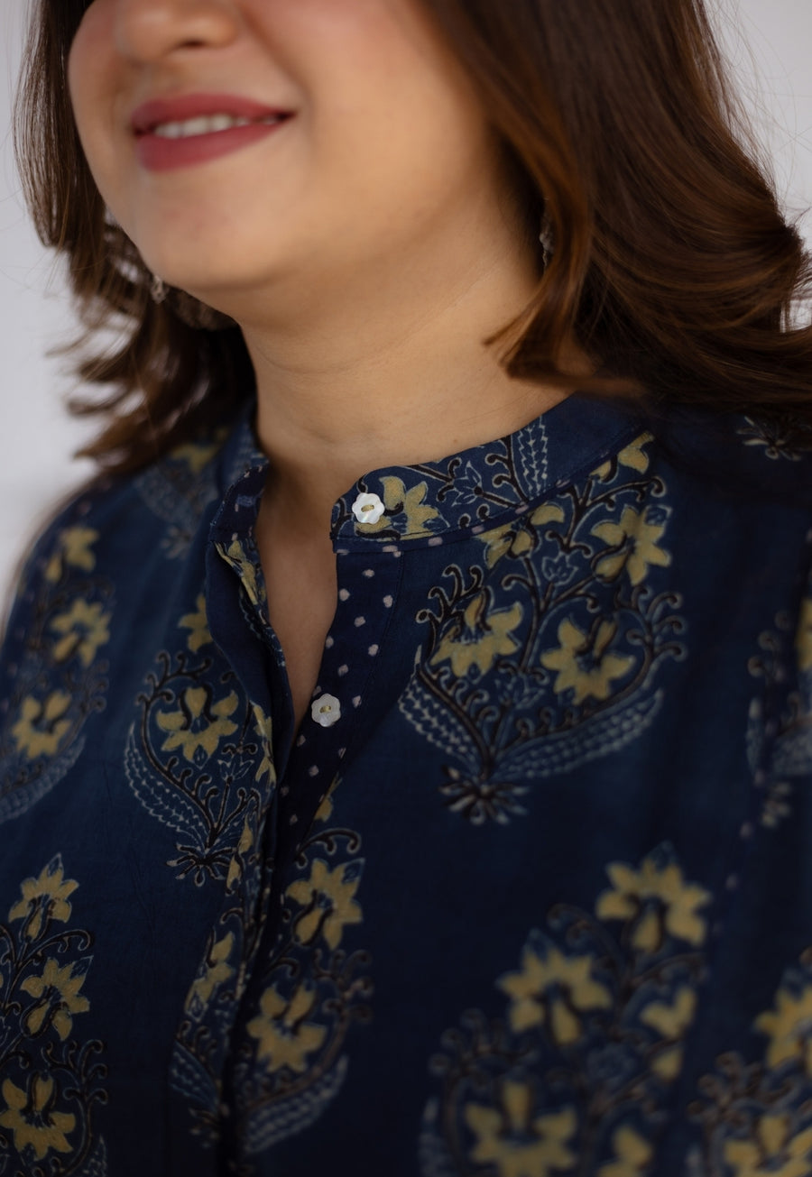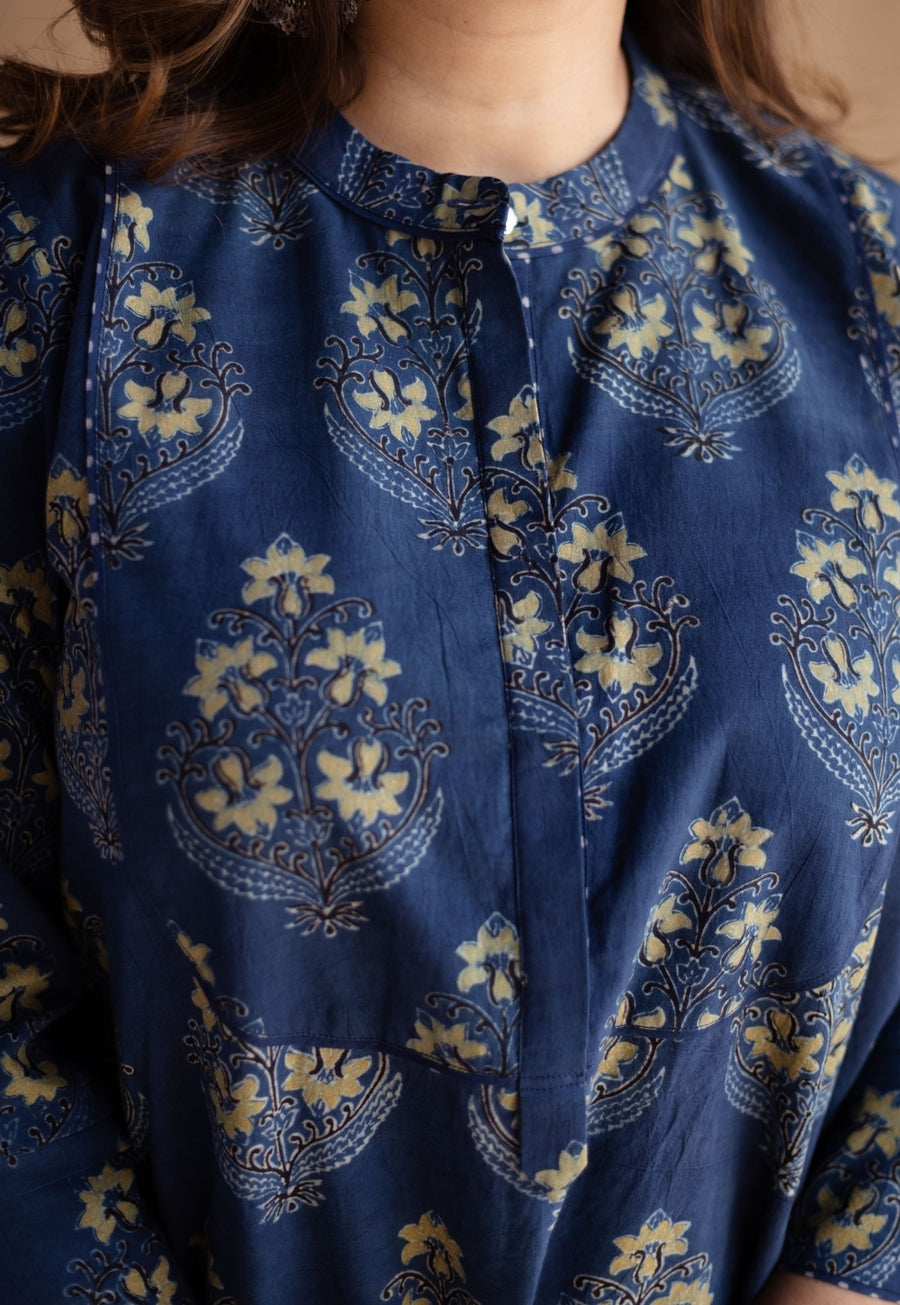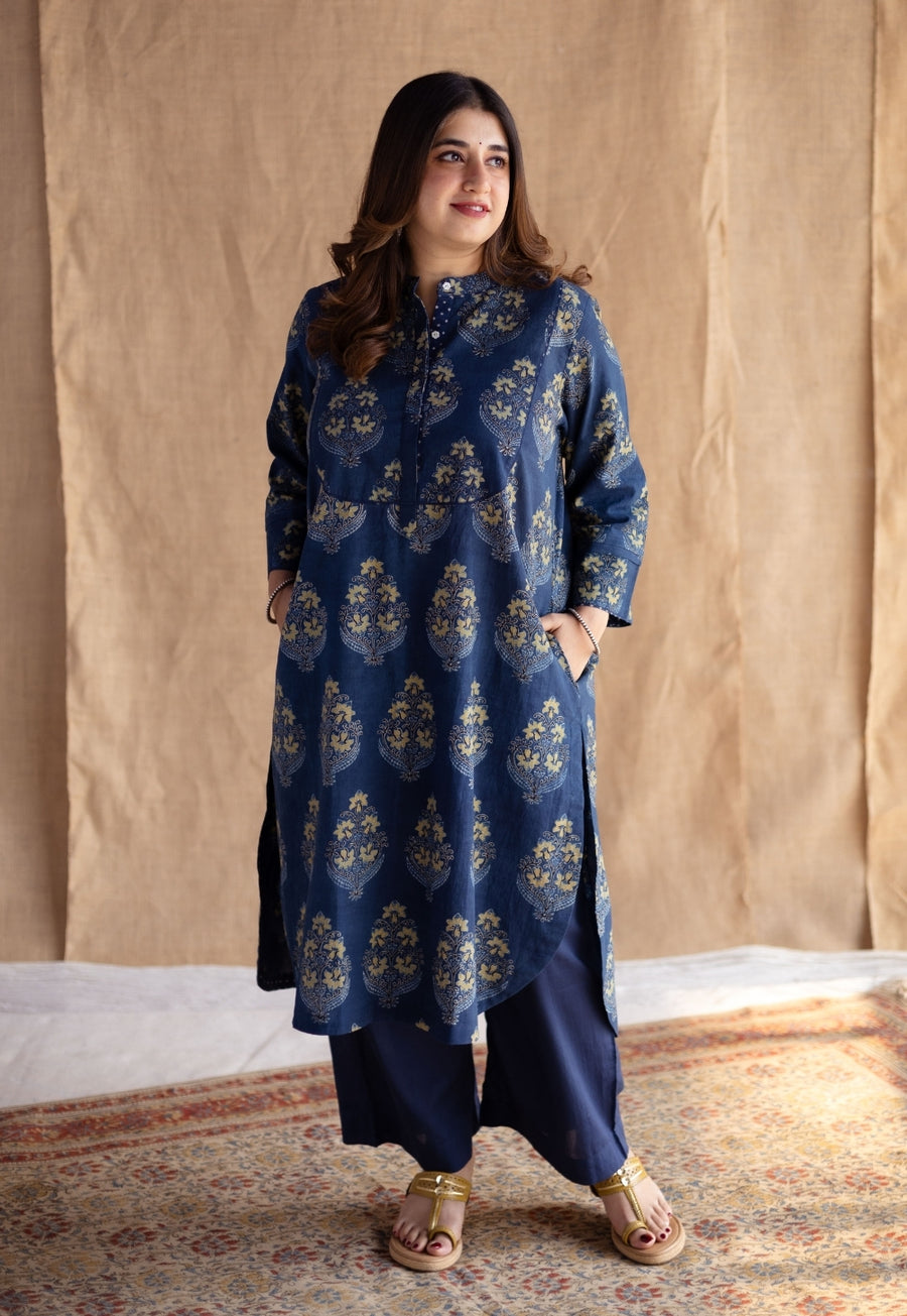 Design Details: Navy straight-cut Soft Crepe kurta and wide-leg trouser set with gold block-style floral print, band collar, and partial button placket